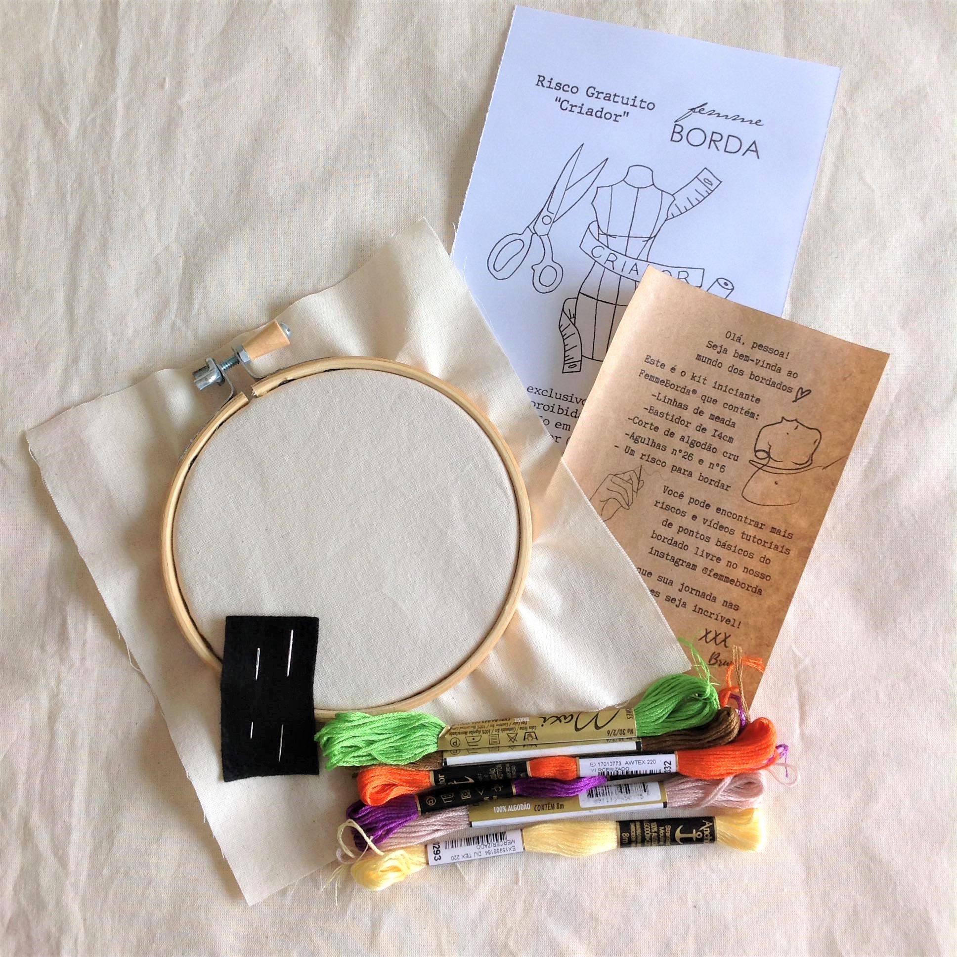 O kit contém: Bastidor de bambu 14cm com regulagem, 6 linhas de meada sortidas, agulha 26, agulha 6, recorte de algodão cru e um risco gratuito para bordar.